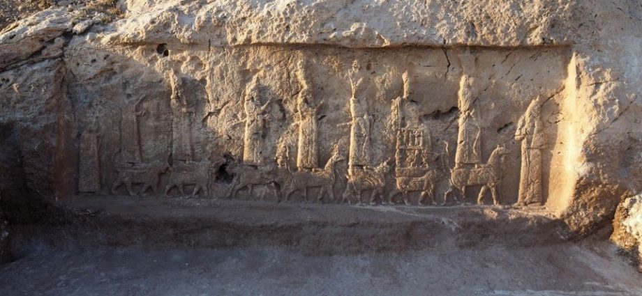 Lì, gli archeologi hanno trovato i lunghi bassorilievi alti 2 metri e lunghi 5. Su di essi sono raffigurate alcune figure sacre, dal dio Assur, la principale divinità del pantheon assiro, su un dragone e un leone con corna, a sua moglie Mullissu, seduta su un trono sorretto da un leone. Sono presenti anche il dio della Luna, Sin, anch’egli su un leone con corna, il dio della Sapienza, Nabu, su un dragone, il dio del Sole, Shamash, su un cavallo, il dio della Tempesta, Adad, su un leone con corna e un toro e Ishtar, la dea dell’Amore e della Guerra, anch’essa su un leone. Meraviglia archeologica e artistica.
