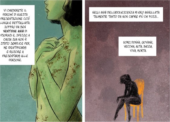 Tra tutte queste storie la Giuria ne ha selezionata una, quella di una giovane donna siciliana, Rosi S., che insieme alle altre storie ha ispirato la matita di Sergio Algozzino, uno dei più affermati illustratori italiani, che ha tradotto le parole della paziente in una graphic novel, ovvero un romanzo grafico che racconta per la prima volta in questa forma artistica la convivenza con la psoriasi.
