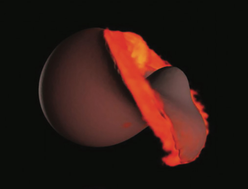 Quando Theia e la Terra si incontrano una seconda volta, Theia ha rallentato considerevolmente e i due oggetti mescolano materiali nella collisione, come mostrato qui nella simulazione. La Luna si forma dal disco che circonda la Terra.
