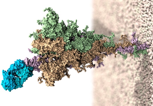 Figura: Rendering al computer della proteina Spike di SARS-CoV-2 a lunghezza intera, incorporato in un modello di membrana ed in complesso con l’anticorpo monoclonale bamlanivimab (in azzurro).