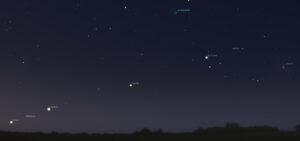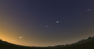 ‎Giove trasformerà il trio in un quartetto a metà aprile. Marte sarà un punto arancione sotto e a sinistra di Saturno, mentre Venere si vedrà come l’astro più luminoso sotto e a sinistra di Marte. Giove sarà il più basso e il più a sinistra nel cielo.‎