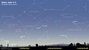 Per tutto giugno, poco prima del sorgere del Sole, gli spettatori potevano vedere Mercurio, Venere, Marte, Giove, Saturno – in quest’ordine – che si estenderanno attraverso il cielo, dal basso a est, fino in alto a sud.