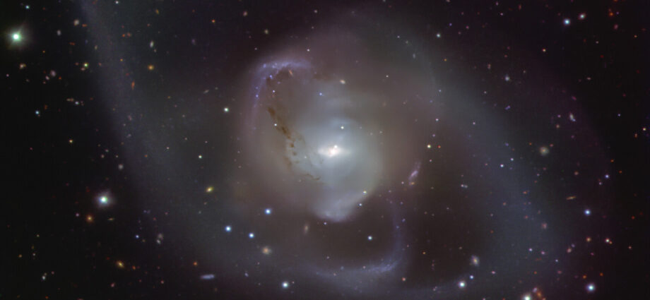 In questa immagine presa con il VLT dell’ESO vediamo le scie intricate create durante la fusione delle galassie, che si sono strappate stelle e polvere a vicenda per creare i lunghi e spettacolari bracci che attorniano NGC 7727.