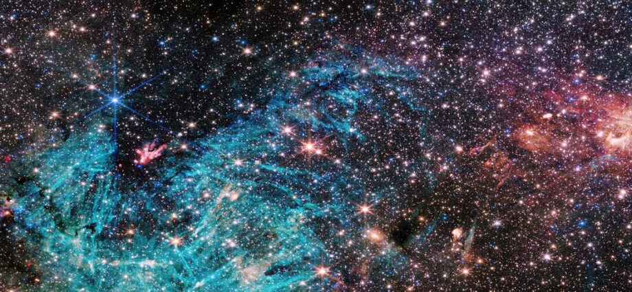 Lo strumento NIRCam (Near-Infrared Camera) di Webb ha anche catturato l’emissione su larga scala dell’idrogeno ionizzato che circonda il lato inferiore della nube scura, mostrata di colore ciano nell’immagine.