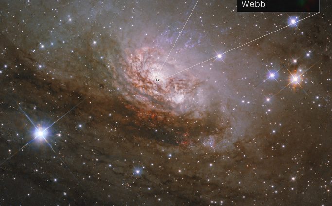 La Galassia del Compasso, a circa 13 milioni di anni luce di distanza, contiene un buco nero supermassiccio attivo che continua a influenzarne l’evoluzione. La maggiore fonte di luce infrarossa proveniente dalla regione più vicina al buco nero stesso si pensava fossero flussi di uscita, ovvero flussi di materia surriscaldata che si sparano verso l’esterno. Ora, nuove osservazioni del James Webb Space Telescope della NASA, qui viste con una nuova immagine del Hubble Space Telescope della NASA, forniscono prove che invertono questo pensiero, suggerendo che la maggior parte del materiale caldo e polveroso alimenti in realtà il buco nero centrale.
