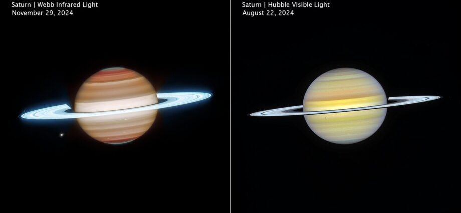 Il telescopio spaziale NASA/ESA/CSA James Webb e il telescopio spaziale Hubble della NASA/ESA hanno unito le forze per catturare nuove viste di Saturno, rivelando il pianeta in modi sorprendentemente diversi.
